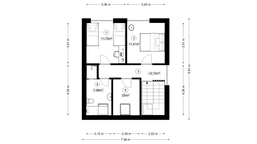 V přízemí se nachází prostorný a světlý obývací pokoj s kuchyňí, který tvoří srdce celého domu a je ideálním místem pro rodinný život i společné chvíle s přáteli. Samozřejmostí je také technická místnost, která poskytuje potřebné zázemí pro domácnost. V patře se nacházejí tři samostatné pokoje a koupelna vybavená jak vanou, tak sprchovým koutem.